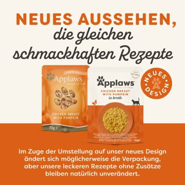 L'aliment complémentaire de Applaws est 100% naturel et a un goût de poitrine de poulet et d'asperge. Il est composé de 75% de poitrine de poulet et de potiron. Applaws insiste pour n'utiliser que des protéines de viande de haute qualité, de qualité humaine, dans ses sachets. De plus, la nourriture est imprégnée dans un bouillon savoureux. Pour garantir une alimentation équilibrée, cet aliment complémentaire doit être donné en complément des croquettes Applaws