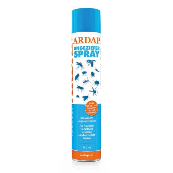 Préparation universelle pour la lutte contre les parasites avec effet immédiat et à long terme jusqu'à 6 semaines. Insecticide ingestif et de contact à utiliser contre toutes sortes de mouches, diptères et autres parasites ou nuisibles, tels que coléoptères, acariens, tiques, puces, blattes, mites, moustiques, poissons d'argent, araignées, cloportes, fourmis, guêpes, etc. dans les espaces domestiques et professionnels et dans l'élevage (pigeonniers, cages à oiseaux, abris pour animaux, etc.). Avec le spray antiparasitaire universel ARDAP, les vétérinaires* et les consommateurs* ont à portée de main un produit immédiatement utilisable et efficace dans toutes les situations. Pour les grandes surfaces et les étables, l'idéal est d'utiliser ARDAP Concentré dans la dilution recommandée.