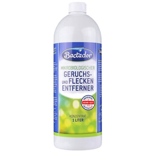 NETTOYAGE INTENSIF : Pour éliminer correctement et durablement les odeurs et les taches, il est nécessaire de ne pas seulement masquer la source de l'odeur, mais de l'éliminer efficacement. Le détachant Bactador élimine rapidement et en profondeur les odeurs et les taches dans l'environnement des animaux et la maison, par ex : les taches d'excréments et d'urine, les odeurs d'animaux domestiques et le marquage du territoire, la sueur, la salive et le vomi, les taches de nourriture et de boisson.