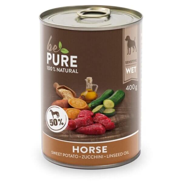 La nourriture humide pour gâter votre chien - La nourriture humide au cheval, aux légumes et à l'huile de lin de bePure est idéale pour les chiens adultes et sensibles. Cet aliment complet a une teneur élevée en viande et est composé à 100% d'ingrédients naturels. La viande de cheval se compose de muscle, de cœur, de poumon et de foie. La courgette est pleine de calcium, de magnésium, de fer et de vitamines qui ne peuvent qu'avoir un effet positif sur votre chien. L'huile de lin rend le pelage brillant. La patate douce est pleine de vitamines, de magnésium, de calcium et donne une bonne dose d'énergie à votre chien.