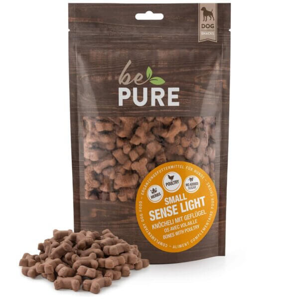 Grâce à leur sachet refermable, nos biscuits Small Sense light de bePure sont l'en-cas idéal pour les chiens en déplacement. Grâce à leur forme ludique, les biscuits ont non seulement la taille parfaite, mais ils attirent également le regard. Le snack est composé de volaille et d'herbes. Fais-le goûter à ton boule de poils préférée.