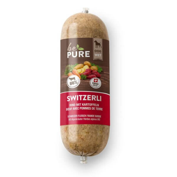 L'aliment humide pour chiens de Suisse - Les saucisses Switzerli au bœuf et aux pommes de terre de bePure sont fabriquées en Suisse, contiennent 100% de viande suisse et sont sans gluten. La saucisse a une teneur élevée en viande et peut être donnée comme snack ou comme aliment complet. Les Switzerli de bePure ne sont pas seulement un régal pour les papilles de ton compagnon à quatre pattes préféré, mais leur emballage attire également tous les regards.