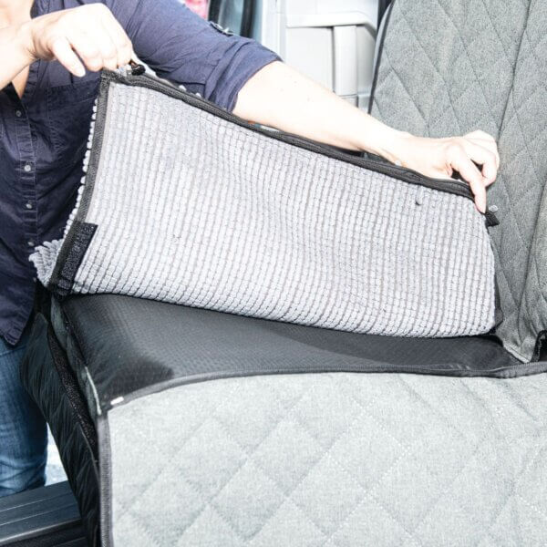 La housse dispose même d'ouvertures en velcro pour les ceintures de sécurité de la voiture, afin que tu puisses utiliser une laisse de voiture si nécessaire.
