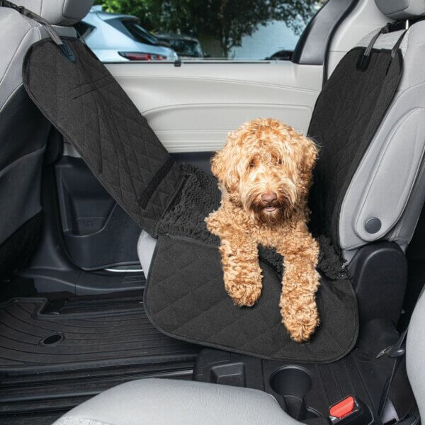 Le Dirty Dog Seat Cover de Dog Gone Smart garde tes sièges de voiture exempts de saleté, de boue, d'eau, de bave et de fourrure pendant que ton chien voyage confortablement sur le siège arrière. L'assise est fabriquée en microfibre Dirty Dog moelleuse et très absorbante, sur laquelle les chiens aiment se blottir. Le protège-siège dispose d'une force d'absorption extrême, des milliers de brins de microfibres qui absorbent plusieurs fois leur poids et brossent en douceur la saleté et la crasse. La fonction hamac empêche ton chéri de sauter vers l'avant. Le dossier et le hamac sont fabriqués en tissu Oxford résistant et imperméable, de sorte qu'aucune partie de ton siège ne reste sans protection.