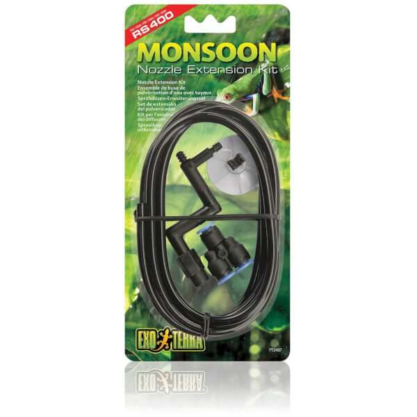 Le kit d'extension de buses d'arrosage Monsoon Exo Terra comprend une buse d'arrosage facile à installer qui vous permet d'étendre le système d'arrosage dans votre terrarium existant ou d'étendre le système d'arrosage sur plusieurs terrariums. Le système d'arrosage Monsoon RS400 Exo Terra peut facilement être étendu avec jusqu'à 4 buses de pulvérisation (pour un total de 6 buses).