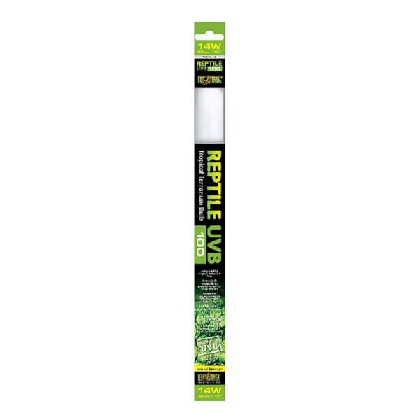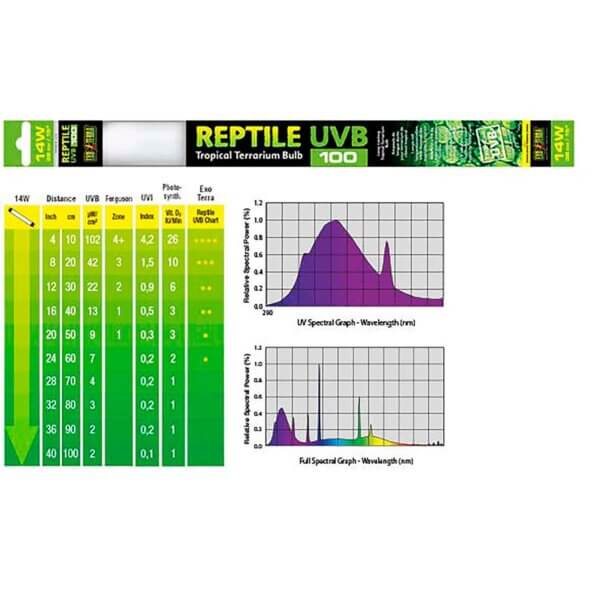 L'ampoule UVB100 Exo Terra Reptile émet des quantités optimales d'UVB, semblables à celles des environnements ombragés tels que les forêts tropicales et autres lieux tropicaux. Les reptiles qui vivent dans ces habitats reçoivent des quantités modérées de rayons UV en raison des conditions climatologiques (humidité assez élevée, changements de temps, etc.). Cela permet d'éviter que la lumière du soleil non filtrée n'atteigne les reptiles qui prennent le soleil. L'indice d'utilité optimal de la vitamine D3 garantit la photosynthèse de la vitamine D3, qui contribue à l'absorption du calcium et protège contre le ramollissement des os.