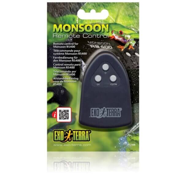 La télécommande Monsoon Exo Terra fonctionne avec le Monsoon RS400 Exo Terra. Elle vous permet de mettre l'unité en marche, de l'arrêter ou de la mettre en cycle à distance. Elle est également idéale pour mettre l'unité en marche ou l'arrêter temporairement, pour augmenter manuellement l'humidité, pour vérifier la performance des buses ou simplement pour s'assurer que l'unité fonctionne correctement. Le fait d'allumer ou d'éteindre l'unité à distance permet également d'éviter le stress chez les animaux. 2 piles AAA ne sont pas incluses.
