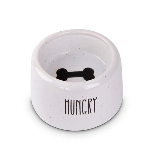 Le bol haut en céramique blanche est émaillé et décoré de l’inscription Hungry sur le devant. Un os apparaît à l’intérieur dès que le chien a fini de manger. Le rebord saillant est idéal pour éviter que les aliments ne débordent. Convient aux besoins quotidiens tels que l’eau, les aliments secs ou humides.