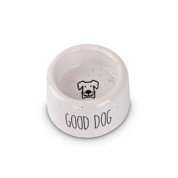 Le bol haut en céramique blanche est émaillé et décoré de l’inscription Good Dog sur le devant. Une jolie tête de chien apparaît à l’intérieur dès que le chien a fini de manger. Le rebord saillant est idéal pour éviter que les aliments ne débordent. Convient aux besoins quotidiens tels que l’eau, les aliments secs ou humides.