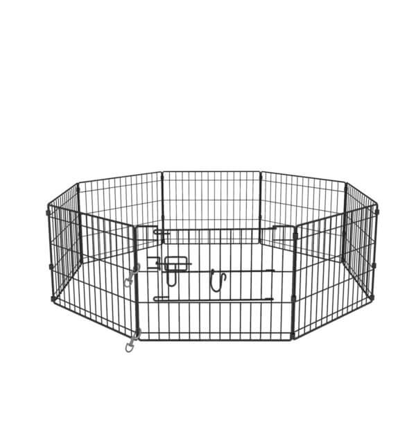 Enclos pour chiots Idéal pour l'élevage de chiots. Cet enclos convient pour l'intérieur et l'extérieur. La porte grillagée a un seuil surélevé et peut être verrouillée à l'aide de mousquetons. Il se monte et se démonte rapidement et peut être facilement plié et rangé de manière peu encombrante. Il est doté d'une structure métallique robuste et résistante avec un espacement de 3,6 cm entre les barreaux. Tu peux installer l'enclos de différentes manières. Conseil de sécurité : les chiots ne doivent pas porter de collier dans l'enclos.