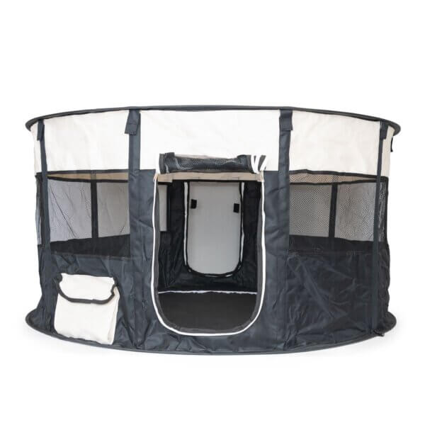 Tu as un jeune chien ? Ou ta chienne a donné la vie à de jeunes chiens ? Dans ce cas, l'enclos pour chiots Freezack Puppy Playgound est un véritable atout, car cet enclos pour chiens tient les chiots en respect. Tu peux installer l'enclos à l'intérieur ou à l'extérieur. La construction ronde en barres de fibre de verre offre un design résistant aux jeunes dents et griffes. De plus, le fond et l'ouverture supérieure sont munis d'une fermeture éclair amovible. Livré avec un sac de transport pratique.