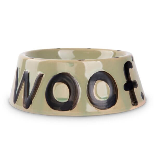 Le bol rond en céramique verte, émaillée et brillante est parfait comme bol à eau ou à nourriture. Les points noirs en relief et l’inscription Woof rendent ce bol unique et particulièrement attrayant. Grâce à son propre poids, il ne glissera pas lorsque votre petit compagnon affamé se jettera dessus.