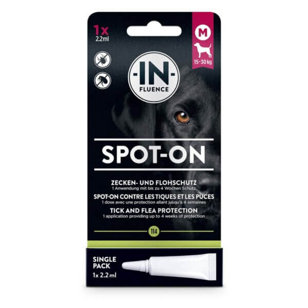 Notre IN-FLUENCE Spot-On Singlepack M convient aux chiens de 15 à 30 kg. Les 3 substances actives répulsives, l'icaridine, l'huile d'eucalyptus citronné et le géraniol, formulées de manière innovante et combinées à la précieuse huile de coco, protègent ton chien de manière fiable contre les tiques et les puces. Une application offre jusqu'à 4 semaines de protection. Remarque : en cas d'infestation existante de puces, utiliser au préalable un médicament vétérinaire. Ne pas utiliser le produit sur les animaux en gestation/allaitants ni sur les chiots de moins de 12 semaines.