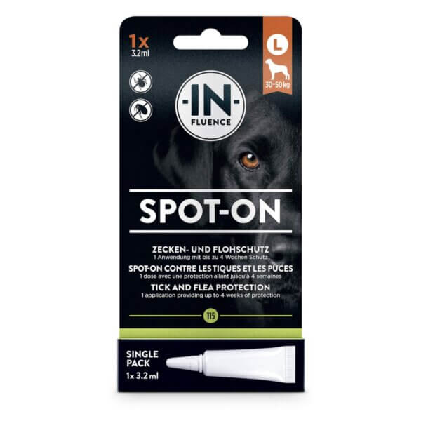 Notre IN-FLUENCE Spot-On Singlepack L convient aux chiens de 30 à 50 kg. Les 3 substances actives répulsives, l'icaridine, l'huile d'eucalyptus citronné et le géraniol, formulées de manière innovante et combinées à la précieuse huile de coco, protègent ton chien de manière fiable contre les tiques et les puces. Une application offre jusqu'à 4 semaines de protection. Remarque : en cas d'infestation existante de puces, utiliser au préalable un médicament vétérinaire. Ne pas utiliser le produit sur les animaux en gestation/allaitants ni sur les chiots de moins de 12 semaines.