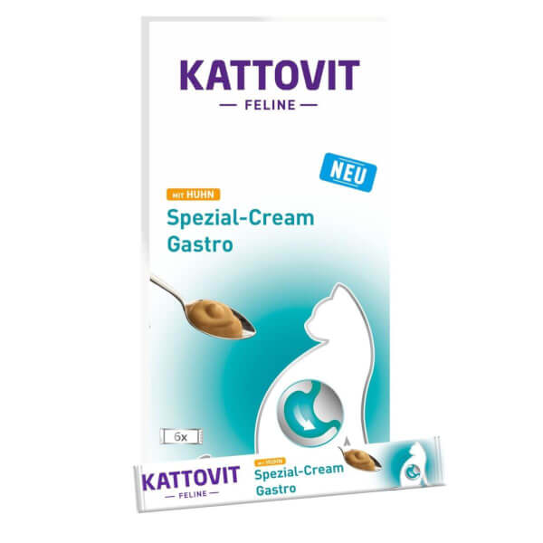Kattovit Crème spéciale Gastro au poulet pour chats. Friandise gastro avec une teneur accrue en électrolytes. Pauvre en graisse et facile à digérer. Un paquet contient six portions de 15g.