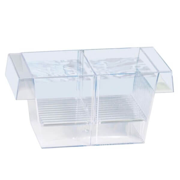 Une grille de séparation et une paroi de séparation, toutes deux amovibles, divisent le bac horizontalement et verticalement. Si tu introduis une femelle gravide dans une moitié et qu'elle libère ses petits, ceux-ci ont la possibilité de se réfugier sous la grille ou dans l'autre moitié. En effet, juste après la naissance, les poissons nouveau-nés ne sont plus qu'une seule chose pour la mère : de la nourriture.