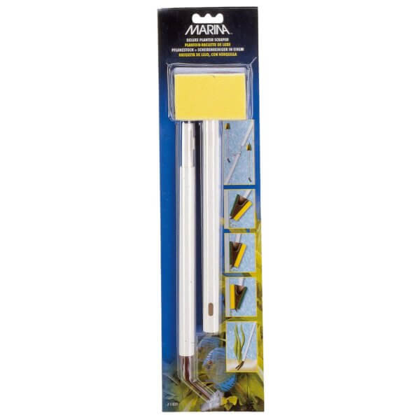 L'éponge nettoyante pour vitres Marina, avec sa quadruple utilité, convient parfaitement aux aquariums en acrylique et en verre. L'éponge fine élimine les algues molles et les stries, l'éponge en nylon (verte) les vieux et les saletés tenaces, la lame de raclage en plastique les dépôts durcis et le bâton végétal avec fourchette sert à introduire les plantes aquatiques et à enlever les objets. Le nettoyeur de vitres est à assembler et mesure 48 cm une fois assemblé, la surface de nettoyage mesure 8 cm de long.