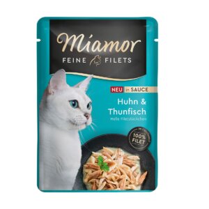 Miamor Filets fins – uniquement des morceaux de filet clair dans une sauce délicate, agrémentés des meilleurs ingrédients. Une spécialité de filet de haute qualité, particulièrement facile à digérer et très bien tolérée, pour les chats exigeants. Sans foie ni abats, sans sous-produits animaux. Recette sans céréales et sans ajout de sucre. Faible en matières grasses – convient également aux chats âgés et en cas de surpoids.