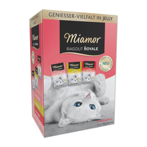 Miamor - Ragout Royale in Jelly 100g sachet fraîcheur 3 sortes dans un paquet avantageux, 4x avec dinde - 4x avec saumon - 4x avec veau. Morceaux de ragoût en gelée délicate. De tendres morceaux préparés dans de la gelée, un plaisir royal. Sans ajout de bœuf, procédé de conservation des vitamines. Sans colorants ni conservateurs.