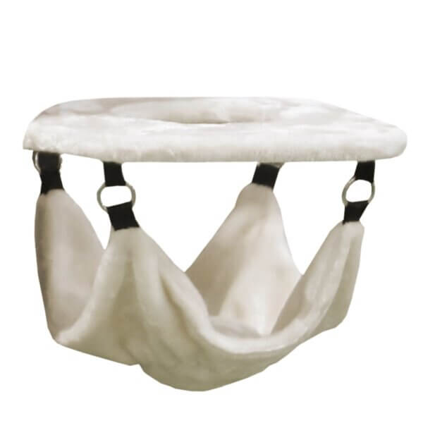 Ce hamac beige de PetRebels se compose d'un petit carré moelleux et suspendu. Il peut être monté sur les arbres à chats Vista ou Scenic View.