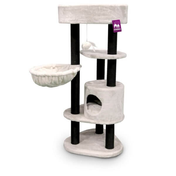 Ein königlicher Dauerbrenner namens Charlotte 134. Gewohnt Petrebels-stabil und robust mit einem Sisaldurchmesser von 5,2 mm und einem Stammdurchmesser von 9 cm. Ein besonderer Baum für eure liebsten Schmusekatzen und Kater. In Summe haben wir eine Schlafhöhle mit extra herausnehmbaren Kissen, eine super kuschelige Hängematte und ein mega-weiches Sofa mit abnehmbarem Kissen eingebaut. Ein wirklich kompletter Baum, der durch seine durchdachte komplexe Bauweise nicht viel Platz in Anspruch nimmt aber trotzdem komplett den Ansprüchen, auch von groß gewachsenen Katzen dank seiner langen Kratzstämme, genügt. Geeignet für alle Katzen, auch für jene, die etwas länger gewachsen sind. Auch 2 Katzen finden dort gut Platz drauf.