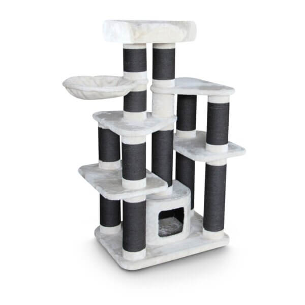 L'arbre à chat Lucky Bastards Skyline 135 de Petrebel offre des surfaces de repos généreuses, un canapé douillet et un hamac pour se détendre et se sentir bien. Le produit dispose de colonnes de 15 cm d'épaisseur et convient aux grands chats. La plaque de base solide assure une bonne stabilité. La grotte et le canapé sont tous deux équipés de coussins moelleux, amovibles et lavables.