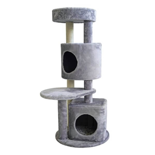 L'arbre à chat Realta 122 allie plaisir de jeu et confort dans un espace réduit. Avec deux grottes douillettes, un canapé de couchage doux et des troncs de 7 cm enveloppés de sisal naturel de 5 mm, il offre des possibilités de retrait et de grattage idéales. Parfait pour les tigres d'appartement actifs et élégant en peluche polyester grise !