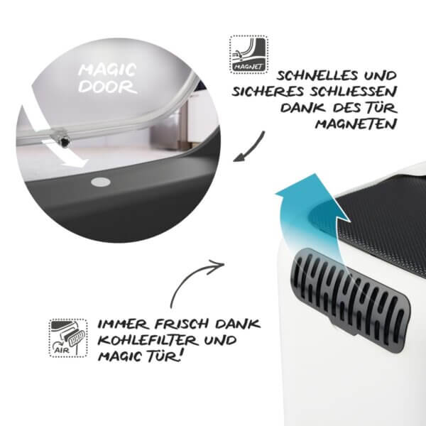 - Grâce à un aimant, la porte se ferme rapidement et reste fermée