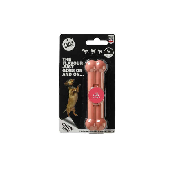 Le Tasty Bone est un jouet à mâcher pour chien au goût délicieux, qui se rapproche le plus possible de la réalité. Ce jouet pour chien est composé à 100 % de nylon solide et résistant. Unique jusqu'à la moelle, enrichi d'arômes irrésistibles, ton chien ne s'ennuiera jamais avec son goût durable. Ce jouet en os a été conçu pour éviter l'ennui et favoriser de bonnes habitudes de mastication. De plus, il contribue à la santé dentaire de ton chien. Cet os a un délicieux goût de bacon et convient parfaitement aux chiens de petite, moyenne et grande taille. Le Tasty Bone est disponible en différents goûts délicieux et en trois tailles. Chaque Tasty Bone peut être nettoyé à l'eau tiède.