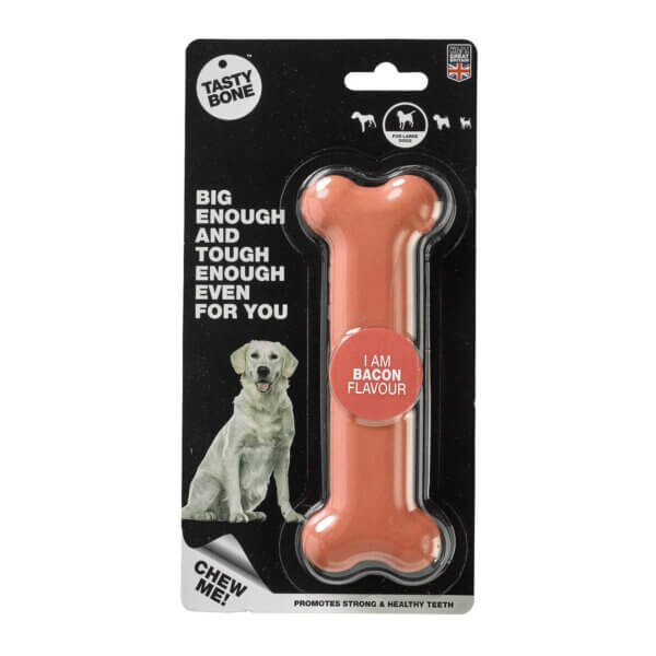 Le Tasty Bone est un jouet à mâcher pour chien au goût délicieux, qui se rapproche le plus possible de la réalité. Ce jouet pour chien est composé à 100 % de nylon solide et résistant. Unique jusqu'à la moelle, enrichi d'arômes irrésistibles, ton chien ne s'ennuiera jamais avec son goût durable. Ce jouet en os a été conçu pour éviter l'ennui et favoriser de bonnes habitudes de mastication. De plus, il contribue à la santé dentaire de ton chien. Cet os a un délicieux goût de bacon et convient parfaitement aux chiens de petite, moyenne et grande taille. Le Tasty Bone est disponible en différents goûts délicieux et en trois tailles. Chaque Tasty Bone peut être nettoyé à l'eau tiède.